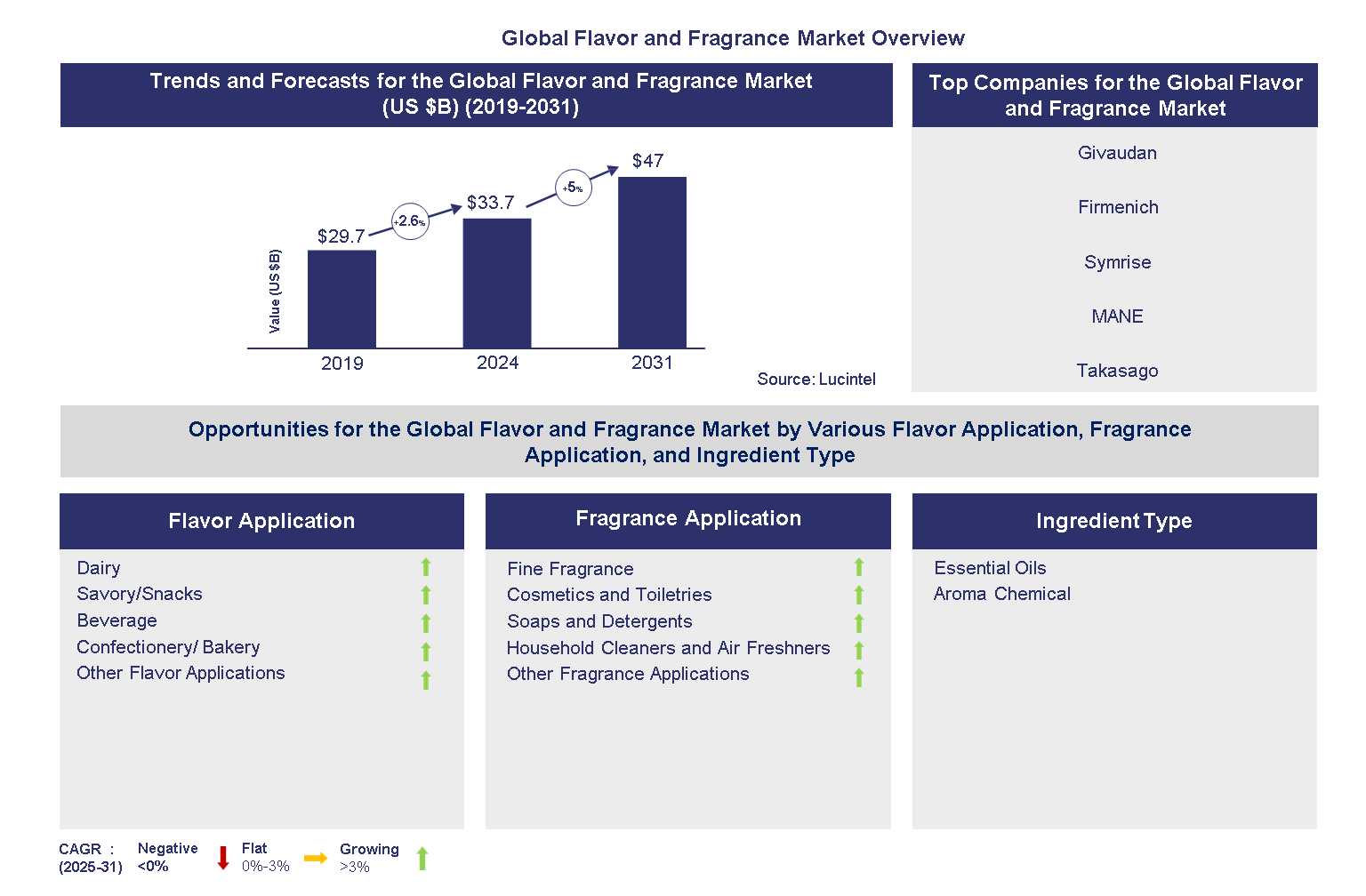 Answer:The global flavor and fragrance market is expected to reach an estimated $47 billion by 2031.